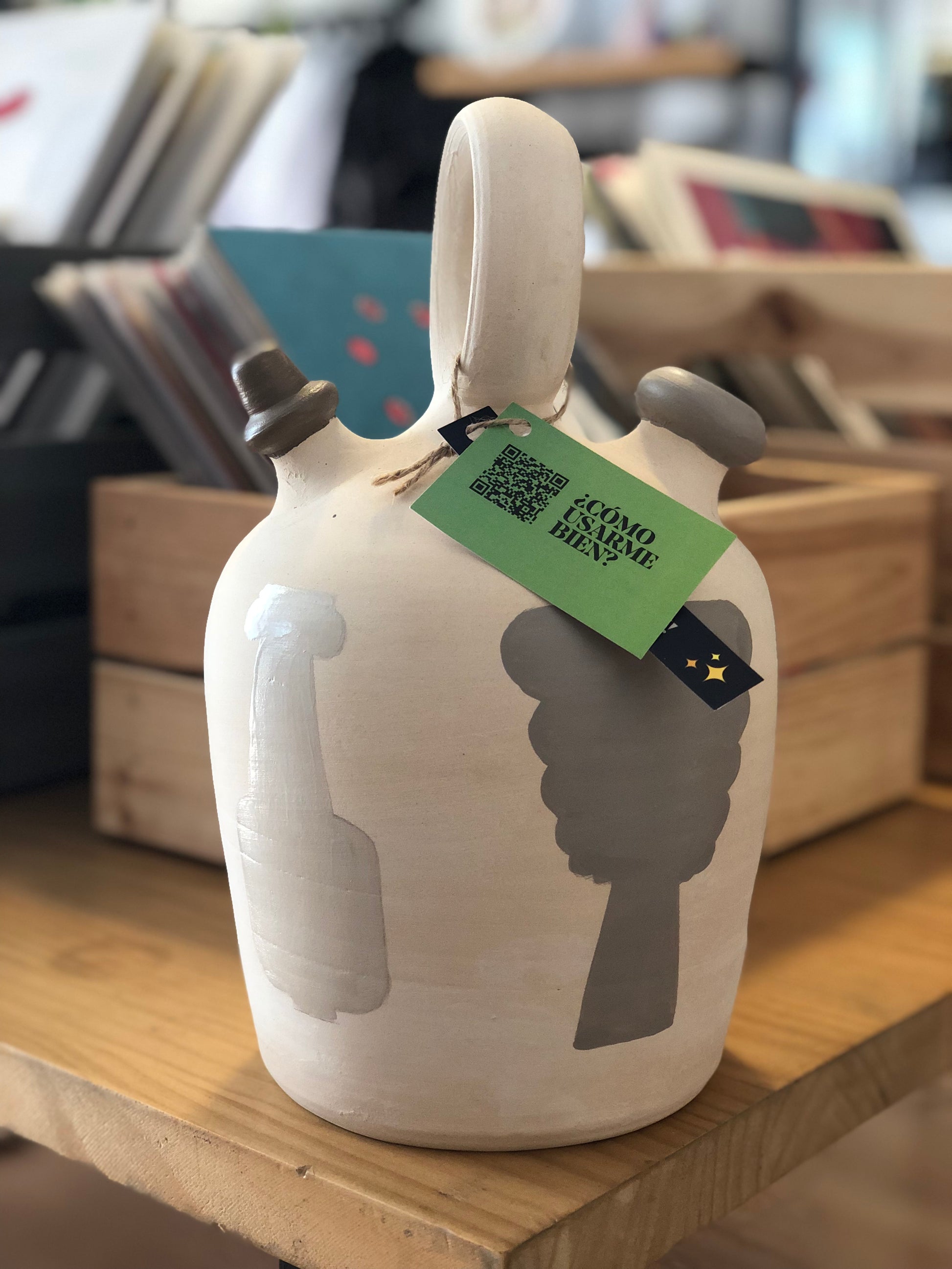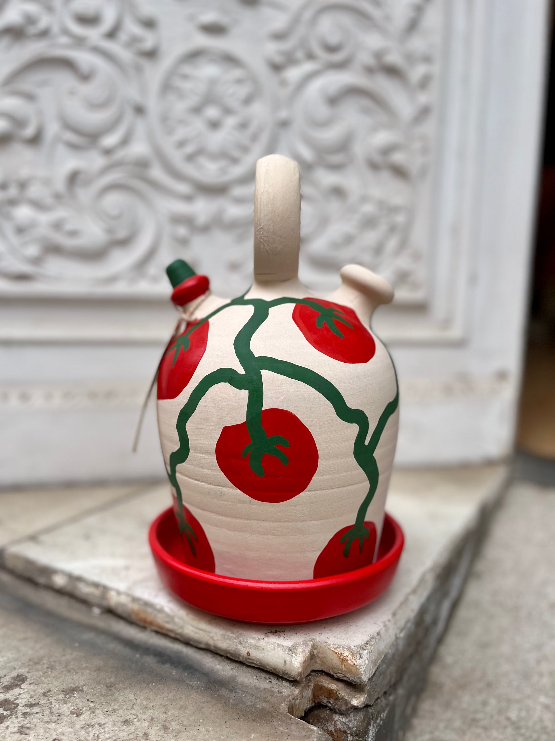 Botijo artesanal, diseñado y pintado por el artista plástico y diseñador Sota Pérez. Los modelos "azul" y "tomates" vienen con platito incluido